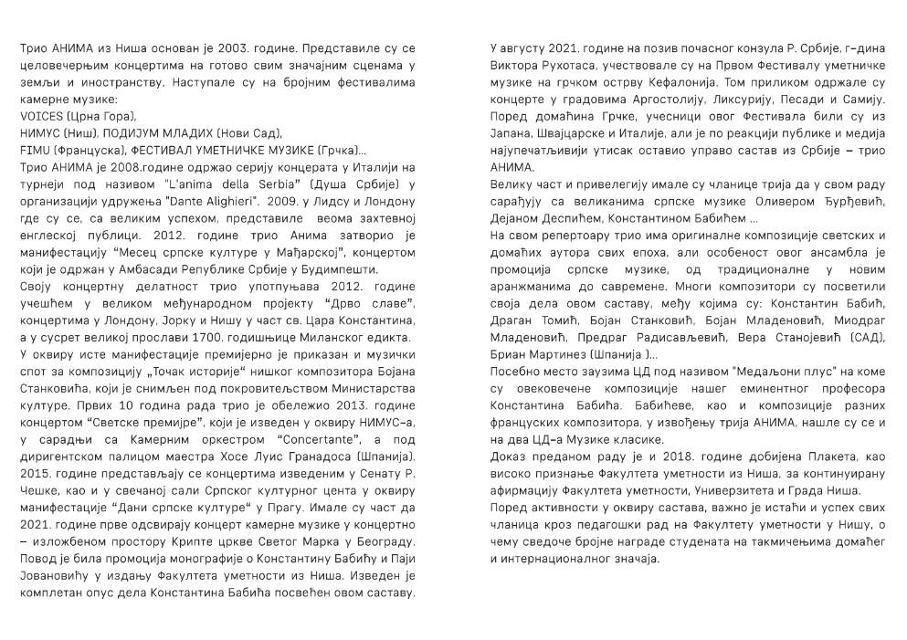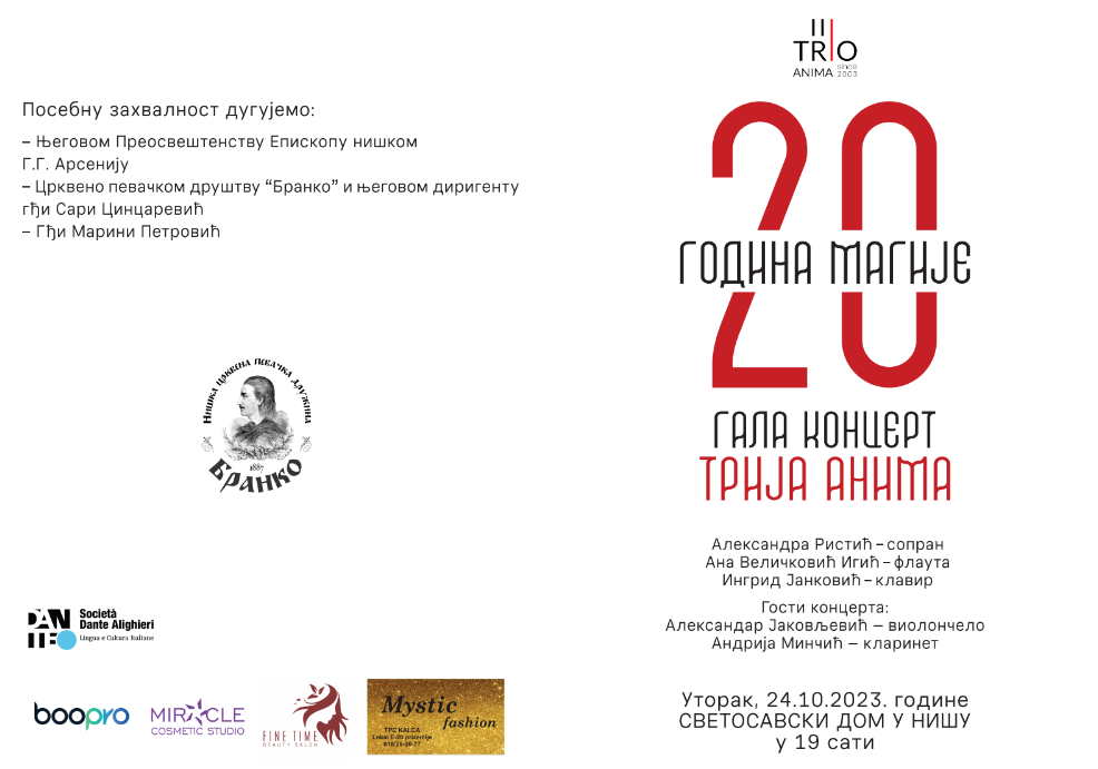 Naziv koncerta “20 GODINA MAGIJE” pravi je vremeplov kroz naše uspomene, najdublje emocije i najuzbudljivije trenutke koje smo delili sa vama u protekle dve decenije.Privilegovane smo činjenicom da će ovaj jedinstveni koncert činiti deset premijerno izvedenih kompozicija, sedmoro renomiranih autora iz zemlje i inostranstva.